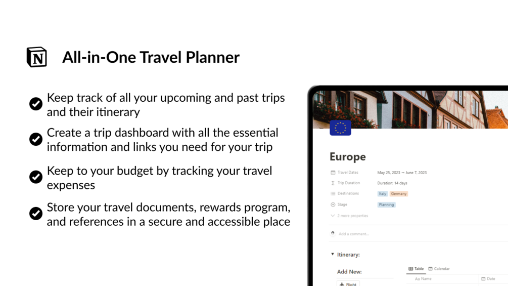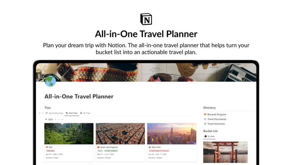 The all-in-one travel planner is a Notion template designed to help you plan, research, and enjoy your trips in one place. With the all-in-one travel planner, you can: